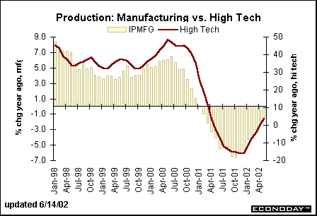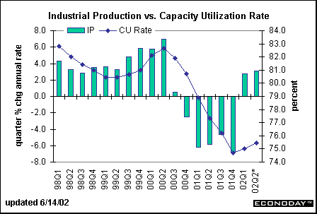 The EconomyProduction inches forwardThe index of industrial production edged up 0.2 percent in May after a downward revised gain of 0.3 percent in April. On a year-over-year basis, production was still down 1.6 percent, but there is no question that the quarterly path shows improvement. Production increased at a 2.7 percent rate in the first quarter and grew at a 3.1 percent rate in the first two months of this quarter. Granted, production has a long way to go to recuperate the sharp declines of the previous five quarters (from the end of 2000 through the end of 2001). Nevertheless, there is room for growth based on the moderate gains we have already seen in factory orders and the fact that inventories are currently so lean.
