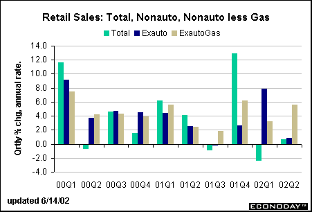 All in all, it appears that production growth is moving at a snail’s pace, but the composition of growth isn’t all that bad. Over the past few months, each of the industries and sectors has picked up, in fits and spurts but a trend that looks like it will continue. Retail sales slideTotal retail sales fell 0.9 percent in May, nearly reversing April’s 1.2 percent rise. A 2.5 percent drop in sales at auto dealers was the primary cause for the weakness, but non-auto sales were also weak, inching 0.4 percent lower during the month. Sales were weakest at general merchandise stores and at clothing and accessory stores. Yet, furniture and electronic/appliance stores performed fairly well. This isn’t surprising given that the housing market is enjoying such extraordinary activity. New homeowners are celebrating by getting new furniture and appliances. The monthly retail sales figures are somewhat misleading because so much of the movement in the past several months has been due to gasoline service stations. Moreover, it isn’t the volume as much as the price action in gasoline that is skewing the data lately. In the beginning of the year gas prices were rising sharply and this boosted gas station sales. But in May gas prices fell and so did gas station sales, dampening total retail sales figures for the month. The chart below shows the quarterly pattern of retail sales, excluding autos and also excluding autos and gas station sales. Notice that nonauto, nongas retail sales were fairly healthy in the first two months of the second quarter relative to the first quarter.