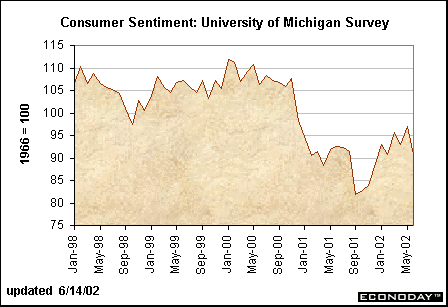 Granted, the monthly pattern of retail is pretty anemic suggesting that consumers have not come back to the mall in full force. The mid-month reading on consumer sentiment dropped to 90.8 from a level of 96.9 in May. When the sentiment index shifts by one or two percentage points, it is usually not very meaningful, but the six point drop is somewhat disconcerting. But consider that the stock market has been declining rapidly over the past month and consumers are bombarded with warnings that terrorist attacks on U.S. soil are a certainty (at some point). Who wouldn’t begin to get more pessimistic? In any case, consumer sentiment can shift rapidly. Thus, if labor market conditions improve and the market would improve, no doubt confidence would pick up as well.
