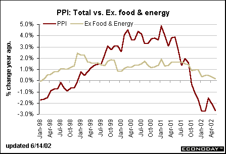 What inflation?The producer price index fell 0.4 percent in May following a 0.2 percent drop in April. Food prices fell 0.2 percent and energy prices declined 2.3 percent. Excluding these two volatile components, the core PPI was unchanged in May and was up 0.1 percent in the two previous months. Consequently, the PPI was 2.7 percent below year ago levels while the core PPI (excluding food and energy prices) was only 0.1 percent above last May.
