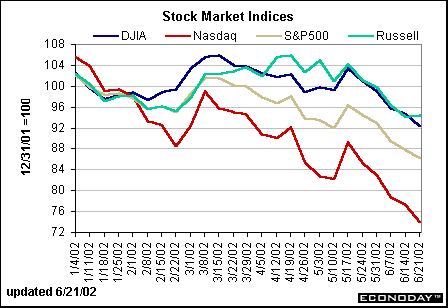 Recap of US MarketsMarket tumbles (still)This week had relatively good economic data, but it didn’t matter to equity investors. They seem engulfed in bad news, be it related to terrorism or corporate malfeasance. The S&P 500 and the Nasdaq composite have fallen to their lowest levels since late September. The Dow Jones Industrials are down sharply over the past several weeks, but not yet near the lows posted in the aftermath of September 11. The Russell 2000 has dropped sharply from the stellar levels it had been showing this year, but nevertheless remains the best performing of these major indices. Small cap stocks are still a sector that could post gains this year.