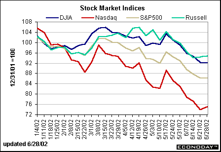 Recap of US MarketsJune has ended, whew!Amazingly enough, the major stock indexes closed at roughly the same levels as last Friday. After the sharp fluctuations this week – and many in a downward direction – one would have expected to see further stock deterioration at Friday’s close. But don’t get excited yet. The picture remains pretty ugly for the end of June (and the end of the quarter). The Nasdaq composite has performed the worst this year and has fallen by the largest amount since mid-May. Yet the Dow Jones Industrials – also known as the blue chip index – has also dropped fairly steeply over the past six weeks mainly due to corporate scandals. The Russell 2000, measuring small cap stocks, continues to outperform the rest of the market as its recovery, though paltry these past three weeks, has still been better than the other indexes.