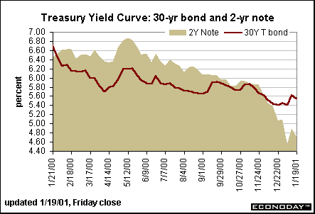 More and more economists are talking about recession - or at least a hard landing in light of the fourth quarter drop in production and ongoing drop in consumer sentiment. While private economists are cautious, Fed officials on the speaking circuit this week were less pessimistic. It is hard to tell whether they were speaking "up" the economy or really believe that conditions are fine. Bond and stock investors weren't quite sure whether it meant that an aggressive easing policy was still in play. The general consensus, though, seems to be weighing in with a 50 basis point rate cut in the funds rate when the Fed meets at the end of the month.
