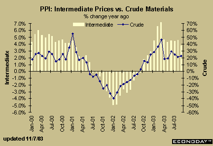 Crude materials prices jumped 3.4 percent in September; in contrast intermediate goods prices dipped 0.1 percent during the month. On a year-over-year basis, crude materials prices are up 22.2 percent while intermediate goods prices are 3.8 percent higher than year ago levels.