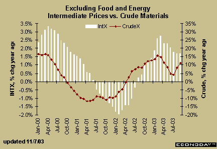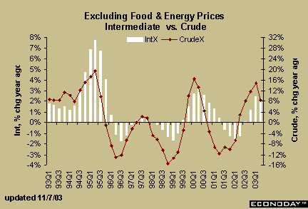 Prices of crude and intermediate materials excluding food and energy seemed to peak in early 2000 on a year over year basis. In the third and fourth quarters of 2000 and throughout 2001, price increases became smaller. Prices turned around in 2002, which reflects a turnaround in manufacturing activity more than it does a potential for accelerated inflation rates for finished goods. While price changes in the earlier stages of processing sometimes get passed along to the finished goods index, there are times when they don't.