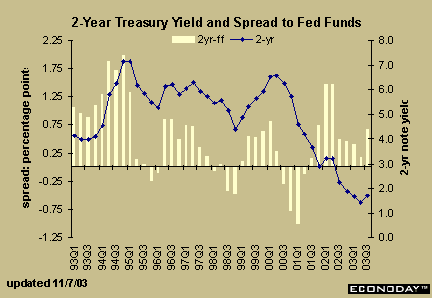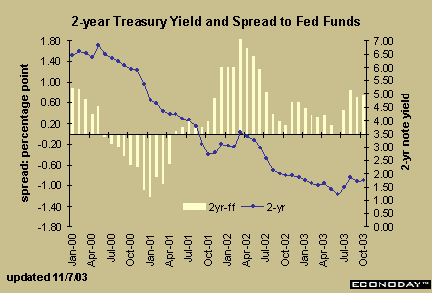 The average yield on the 2-year note edged up 4 basis points in October and the spread between the 2-year note and the fed funds rate increased similarly. The spread tends to widen when bond investors no longer expect the Fed to ease monetary policy.