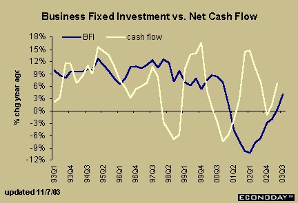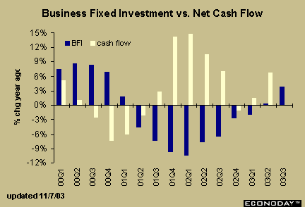 Business fixed investment grew at an 11.1 percent rate in the third quarter, after posting a healthy 7.3 percent gain in the previous quarter. Consequently, capital spending has now posted year-over-year increases for two straight quarters. Cash flow jumped 6.7 percent in the second quarter, but third quarter figures aren't out yet.