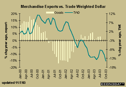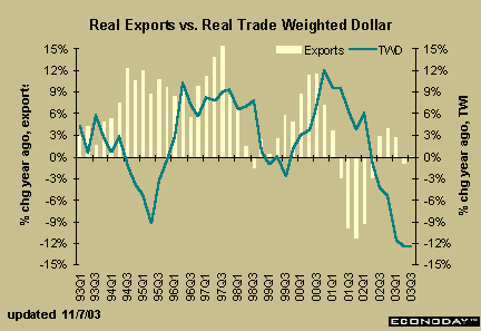 Exports posted solid year-over-year gains from September 2002 through March 2003. Year-over year gains were less robust from April through August, but they are improving again. A declining dollar value in the foreign exchange market should bode well for export demand, but our trading partners are growing at an even more anemic rate than the U.S. so export growth could be limited for a few more months.