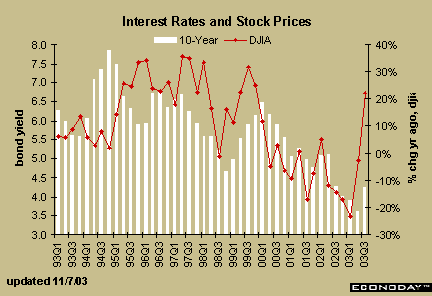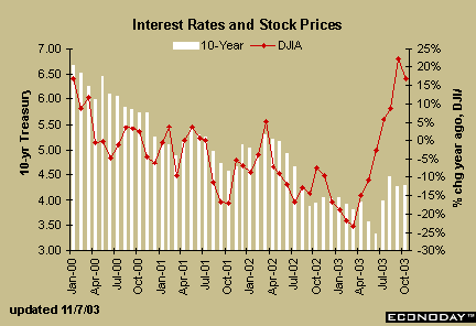 The combination of lower interest rates and declines in yearly returns in the DJIA signaled the slowdown in economic activity we saw in 2001. The yield on the 10-year note was roughly unchanged in October; the Dow increased on a monthly and yearly basis in October.