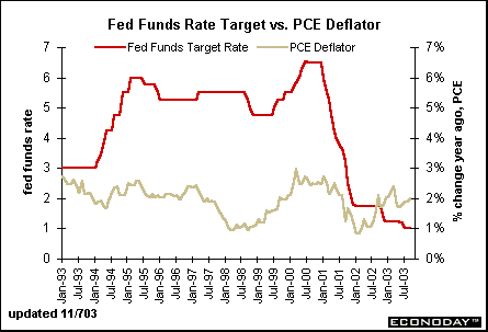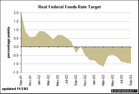 This chart shows the gap between the funds rate and the yearly change in the PCE deflator in a different way. In essence, the gap reflects the "real" (inflation-adjusted) federal funds rate. The federal funds rate target and the year-over-year change in the PCE deflator turned negative in September as the PCE deflator rose 2.2 percent from a year earlier while the fed funds rate target was under 2 percent. In October 2002, the real fed funds rate target was zero, but became negative again from November through September 2003. At these levels, monetary policy is highly stimulative as claimed by several Fed officials in the past few months. Analysts don't expect the Fed to raise rates until 2004.