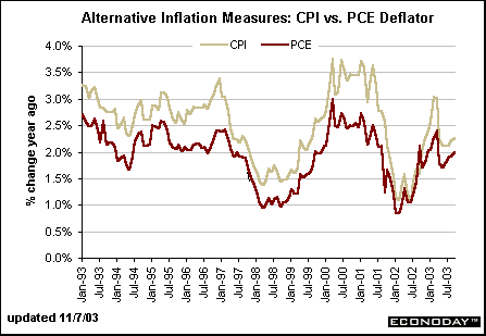 Inflation is always a key indicator among Fed officials. Although the CPI is the most common inflation measure, Fed chairman Alan Greenspan prefers the personal consumption expenditure (PCE) deflator. He believes the latter is more representative of changes in the actual cost-of-living. The discrepancy between the PCE deflator and the CPI widened throughout 2000 and the first half of 2001 perhaps showing a greater shift in the composition of goods and services actually purchased by consumers (towards lower-priced commodities). The PCE deflator incorporates most of the CPI components. Nonetheless, it shows less inflation than the CPI because it also takes into account the fact that consumers substitute lower priced goods for higher priced goods as relative prices change. For example, when the price of chicken falls relative to the price of beef, consumers will buy more chicken. Thus, their actual food costs probably didn't increase as much as indicated by the CPI, which measures a fixed basket of goods and services, and doesn't allow for substitutions.