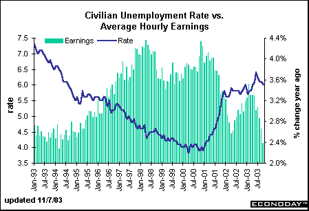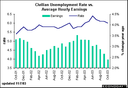 The civilian unemployment rate edged down to 6 percent in October, and is now down 0.4 percentage points from its peak level of 6.4 percent reached in June. With robust economic activity, the jobless rate could head lower, although strong productivity gains are also preventing a sharp drop in the unemployment rate. Average hourly earnings rose 2.4 percent in October, less than last month. Wage hikes will likely remain subdued as long as labor market conditions are lackluster.