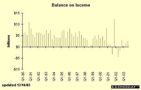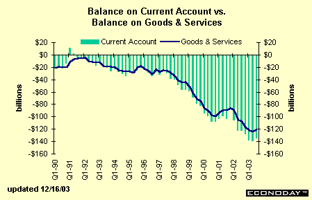 The primary cause behind the escalating current account deficit remains the trade deficit on goods & services. As merchandise imports have increased rapidly, the trade deficit has widened. The surplus on our services balance has diminished over time as import growth has outpaced export growth. In the past two years, a major shift has also taken place on the income balance. It was nearly always positive, but since 2001, it has posted four quarterly deficits aside from some very small surpluses in 2003 that were well below historical averages.