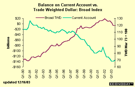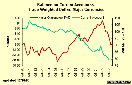 In the past few months, financial markets have primarily focused on the dollar's collapse, albeit orderly, against the euro. The dollar has also fallen sharply against the Swiss franc, the yen, the Canadian dollar, and British sterling. The value of the dollar is not important per se, but primarily relevant in its trade value - what can it purchase? The Federal Reserve Board compiles a trade-weighted index for major currencies that take into account US trade with various countries. (Countries whose currencies are included in the major currencies index are the Euro Area, Canada, Japan, United Kingdom, Switzerland, Australia, and Sweden. The Euro Area includes Germany, France, Italy, Netherlands, Belgium/Luxembourg, Ireland, Spain, Austria, Finland, Portugal & Greece.) The major currencies index has declined roughly 21 percent from its peak in February 2002 through November 2003.