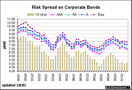 The chart above also compares corporate bonds with the 10-year note. One often hears the term "benchmark" applied to the 10-year note. Corporate bonds are matched against the Treasury security that holds benchmark status in order derive a relevant interest rate. Not only does it make it easier to assess risk by pricing corporate bonds this way, it gives investors some idea as to what they are getting themselves into. As the probability of default and credit ratings increase, yields grow higher and begin to separate themselves from the benchmark 10-year note.