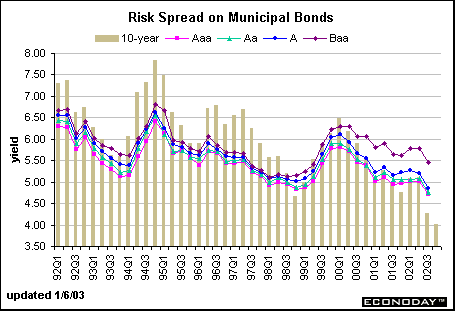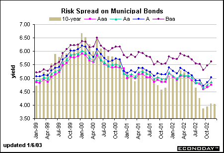 Yields on municipal bonds came down in 2000. However, the drop in these yields was minor relative to the decline in Treasury yields. As a result, the average spread between the 10-year Treasury note and the municipal bond of various risk categories narrowed significantly and actually turned positive from 2000 through 2002. The spread is usually negative by a significant margin, but the reduced supply of long bonds coupled with an increased demand for the new 10-year Treasury benchmark led to a reversal in the normal trend. In fact, the yield on the Baa-rated muni-bond is much higher than the yield on 10-year Treasuries, and even the A bond was higher through November! December data is not yet available for municipal bonds.