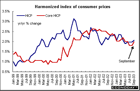 Unemployment - Europe's unemployment rate has been stubbornly high because of labor market rigidities, which make it difficult for employers to lay workers off when business growth weakens. These limitations don't allow business to function with the flexibility that U.S. firms have and reduce costs rapidly in times of slowing growth. Unemployment reached a low in September and October 2001 and has been slowly rising since then.
