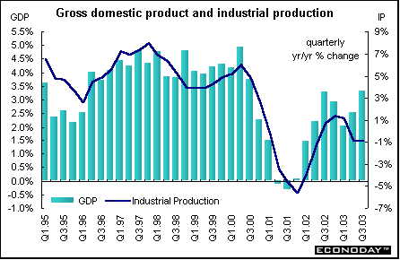 Gross Domestic Product and Industrial Production - After real GDP averaged 3.25 percent annual growth in the 1990s, the economy fell into recession in the second and third quarters of 2001. The events on September 11, 2001 exacerbated the downturn already in progress. Although GDP recovered in the first quarter of 2002, the economy has grown in fits and starts since then. The economy has remained afloat thanks to consumer spending and a strong housing market. But the economy soared during the third quarter, thanks in part to the tax cuts that gave consumers more money to spend. And there were signs that businesses are beginning to spend as well. Industrial production has diminished in proportion to the overall economy and in its effect on business cycles. Yet industrial production, which still accounts for roughly 15 percent of total U.S. production, can still drag growth down. Manufacturing continues to be a drag on the economy although it has been showing signs of life. Advance third quarter GDP surprised analysts when it jumped by an annualized 7.2 percent rate and by 3.3 percent when compared with the third quarter of 2002.