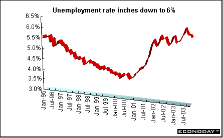 Unemployment - The civilian unemployment rate bottomed at 3.9 percent in September 2000, a rate not seen since January 1970! But with the onset of recession, unemployment has since climbed especially in the manufacturing sector. Increases in unemployment, though, have been mitigated by the mild nature of the recession. Unemployment is typically a lagging indicator and generally increases even after a recovery is in place. Employers wait until demand picks up before hiring new workers. Even at relatively low levels, a rising jobless rate has a negative influence on consumer sentiment. Rising unemployment is usually associated with reduced earnings and reduced retail sales. Employment has continued to shrink, especially in manufacturing. But the unemployment rate has been rather stable as discouraged workers drop out of the labor force and are no longer counted. The unemployment rate inched down to 6 percent in October.