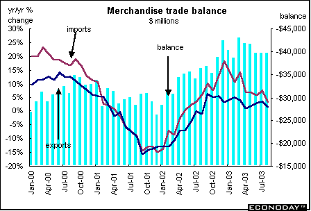 Merchandise trade - The United States reliance on foreign goods intensified in the 1990s, although export growth improved modestly during the period too. In good economic times, imports help alleviate demand pressures and therefore help curtail price inflation for goods and services. In downturns, a decline in demand for goods also leads to a drop in import demands so that foreign producers feel the effect of a U.S. downturn and the negative impact on domestic producers is mitigated to some extent. Investors overseas have mixed feelings about the U.S. trade deficit. On one hand it means that U.S. consumers continue to buy their exports, which in turn stimulates their domestic economies. However, others worry that the spiraling deficit could lead to a precipitous fall in the value of the dollar.