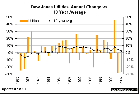 Utility stocks had a phenomenal year in 2000 posting a 45 percent spurt after declining modestly in 1999. Unfortunately, the utility index plunged 28.7 percent in 2001 and 26.8 percent in 2002, thereby more than reversing the surge in 2000. The 10-year average fell to 2.3 percent in 2002, the worst 10-year average since 1982!