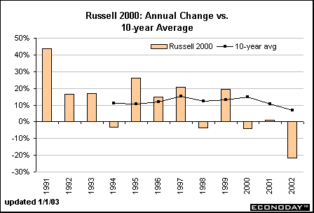 The Russell 2000 posted three declines in the past five years, leading the 10-year average growth to edge down to 6.7 percent in this stock measure in 2002. The Russell 2000 is a benchmark index for the small capitalization sector. It has a longer history than the S&P Small Cap Index and also has a wider base (2000 stocks vs. 600 for the S&P).