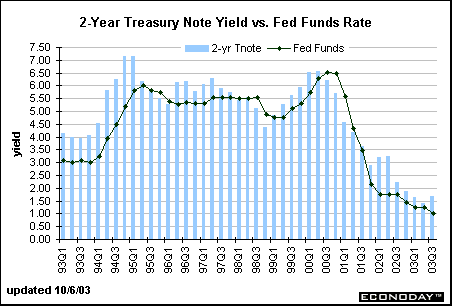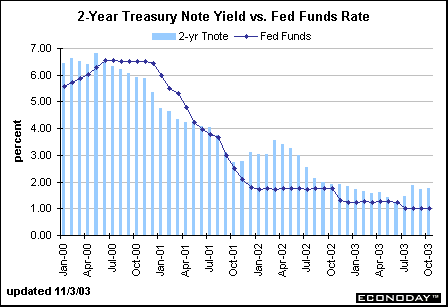 The spread between the 2-year note and the federal funds rate averaged 30 basis points from 2000 to 2002. In early 2000, economic conditions were strong, but this changed in mid-2001 and bond investors began to anticipate Fed easing. After the Fed lowered the fed funds rate target several times in 2001, the yields were in greater alignment. Between October 2001 and December 2002, the 2-year note yield once again surpassed the fed funds rate. In the early part of this period, market players were no longer expecting the Fed to reduce rates in 2002. In fact, the Fed reduced the funds rate target 50 basis points in November. As 2002 came to a close, investors concluded that the Fed was not ready to raise rates in the near term. Furthermore, whenever stock prices collapse or geo-political pressures abound, Treasury securities are investors' safe haven.