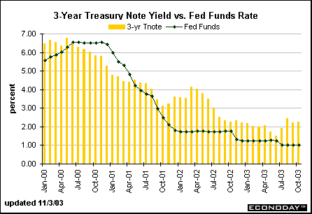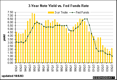 The spread between the 3-year Treasury note and the federal funds rate averaged -181 basis points in the 1980s when interest rate levels were generally much higher than they are today. The spread turned around in the 1990s to average +83 basis points.