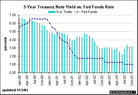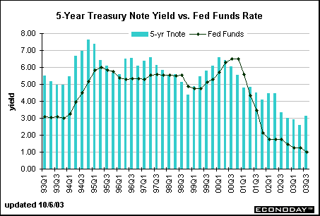 The spread between the 5-year note yield and the federal funds rate averaged 90 basis points between 2000 and 2002. The yield on the 5-year note was higher than the fed funds rate through the first half of 2000 as market players expected the Fed to tighten monetary policy. As economic conditions changed, and investors believed that the Fed would reduce the fed funds rate target, the yield on the 5-year note fell below the funds rate in the second half of 2000. The spread turned around in 2001 after the Fed began to ease aggressively. Along with other Treasury securities, the yield on the 5-year note edged up slightly in April, but dipped in both May and June as bond investors expected another rate cut. The Fed did reduce the funds rate target 25 basis points after their June FOMC meeting.