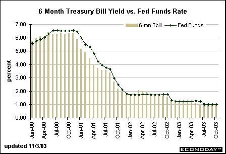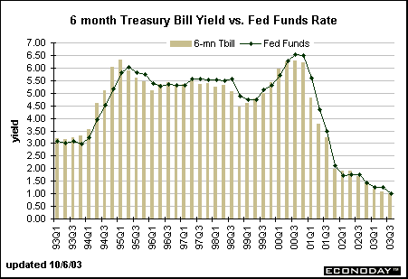 Between 2000 and 2002, the yield on the 6-month Treasury bill was 16 basis points below the federal funds rate, on average. The gap between the 6-month bill and the federal funds rate is virtually zero from July through October.