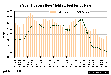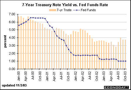 The spread between the 7-year note yield and the federal funds rate averaged +119 basis points from 2000 to 2002. The spread was negative in 2000 and early 2001 before the Fed began to aggressively reduce the federal funds rate target. Yields were about unchanged on average in October relative to September, although yields were higher at month-end than they were at the beginning of the period.